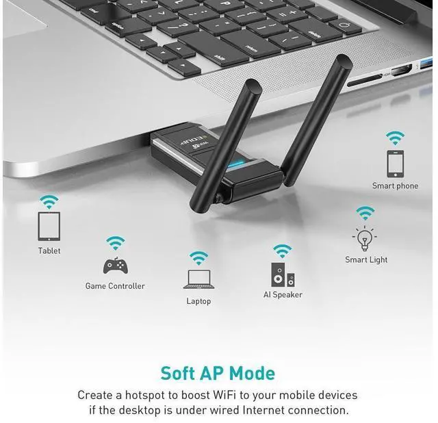 Soft AP mode : Create a hotspot to boost WiFi to your mobile devices if the desktop is under wired Internet connection.