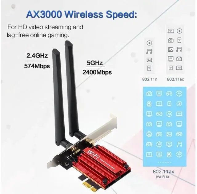 The DE-AX3000 adapter supports Bluetooth 5.1 and 802.11 ac/ax Wi-Fi 6, including wave 2 features such as 160MHz channels. delivering up to 2.4G bps and downlink MU-MIMO.