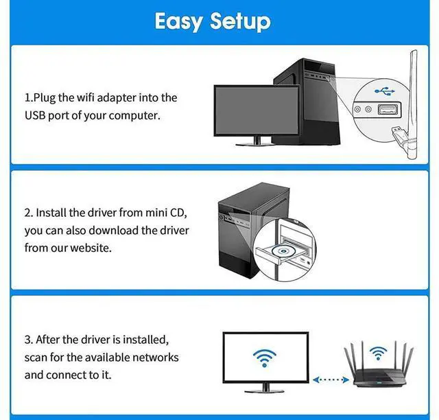 Before plugging the USB Wifi Dongle into the usb port, please FIRST install drivers via MINI CD disc, or download driver from a link to install. Once you've run the software, you can simply insert Wireless Dongle to get connected.
