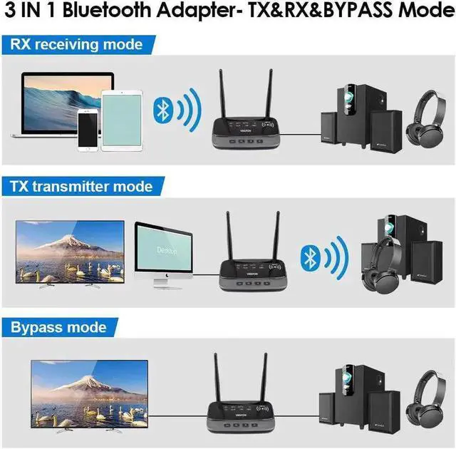 3-in-1 Bluetooth-TX/RX/BYPASS ModeTX Mode: connect bluetooth transmitter to audio output devices, such as TV, iPod or PC, you can enjoy ultra fast, high-fidelity audio from your bluetooth headsets, headphones or speakers flexibility.