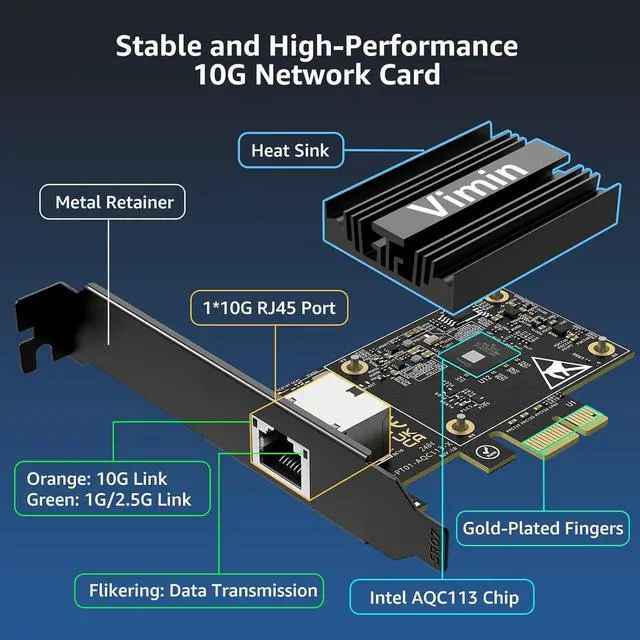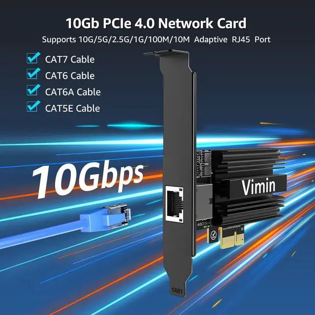 -?? 10GB AQC113 NETWORK CARD This network interface card based on the Marvell AQC113 controller chip is a 10 Gigabit Ethernet PCIe 4.0 x1 card with a single electrical port. It achieves data transfer rates of up to 10 Gbps enabling rapid data transmission and synchronisation between data centres. -?? PCI-e 4.0 X1 X4 X8 X 16: 10 G PCI-E Network Card supports 1 supports the new generation PCIe 4.0 x1(Compatible with PCIe 3.0 / 2.0 ) bus interface and adaptercan converts PCIe slots (X1X4/X8/16) into 10G RJ-45 Ethernet ports. Whether it's transferring large files streaming HD videos or engaging in online gaming you can enjoy a faster and smoother connection.
