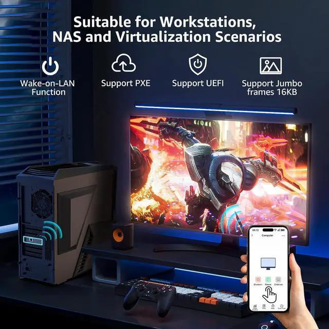 Wake-on-LAN Function: This 10G PCIe ethernet card adapter supports various data rates including 10Gbps/5Gbps/ 2.5G bps/1Gbps/100Mbps Ethernet connections. The Wake-on-LAN feature ensures plug-and-play functionality for network adapters offering convenience and efficiency. -??