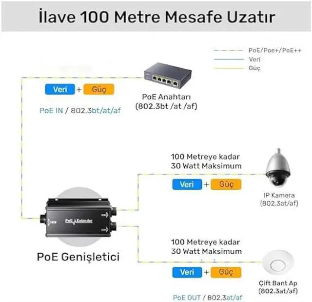 Extends an additional 100m for PoE network. Daisy chain support connect up to 3 PoE Extenders for a total PoE+ network extension of 400m (1, 312 ft. ).