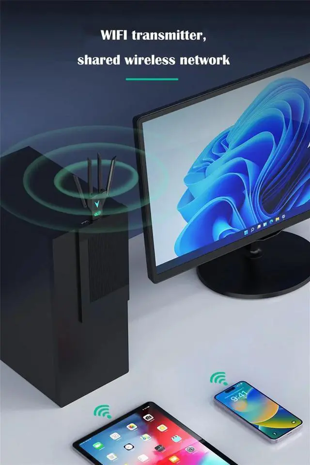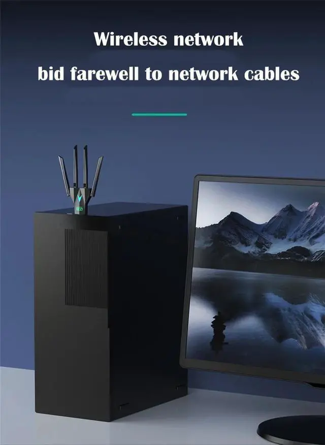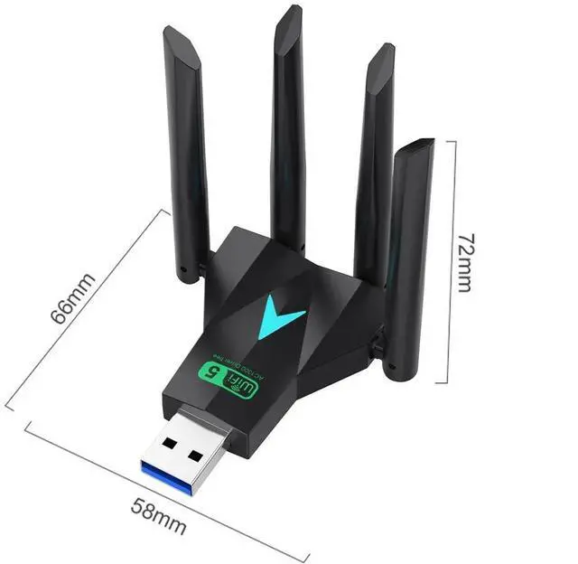 | 1300Mbps Network Card | Productname: Four-antenna USB network card | Chipset: RTL8811 | Antenna standard: EEE 802.11 b/g/n | Transmission rate: 1300Mbps | Frequency range: 2.4G 5G | 9506000171548 | Operating system: WindowsXP/7/8/ 8.1 /10/11(driver-free for Win8 and above system. ) | Note:the product is mainly shown in the first picture, with the others being renderings. |
