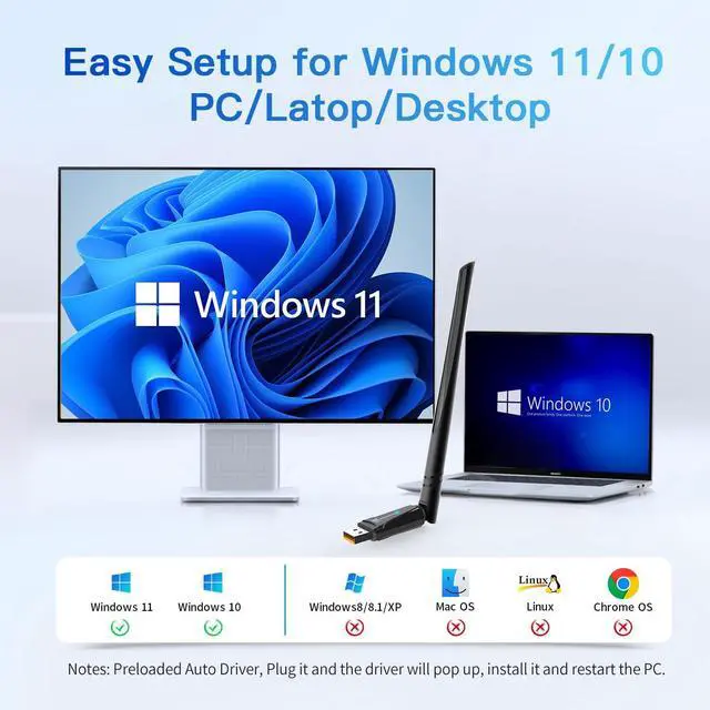 Built-in Auto Driver: This AX909B WIFI Bluetooth 5.4 Dongle is developed for Windows 11/10 PC/Laptop/Desktop only and does not support other systems. It comes with pre-installed drivers automatically recognizing and configuring itself for quick setup on your Windows 10/11 system. No need to download drivers saving time and worry. Please note this Adapter doesn't support MacOS/Linux/Win 8 8.1 7 XP. New Generation