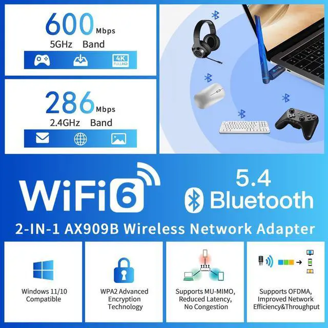 Bluetooth 5.4 Adapter: Krisnorey AX909B network adapter provides lag-free and stable WIFI & Bluetooth connections. Upgrade your PC/Laptop/Desktop new life with our AX900M Wi-Fi 6 and Latest Bluetooth 5.4 USB wireless adapter. Whether your desktop pc's wifi/Bluetooth usb is malfunctioning or youre looking to upgrade to faster dual-band 5GHz/ 2.4GH z speeds its a budget-friendly way to extend your devices life and experience the benefits of modern Wi-Fi 6 and Bluetooth 5.4 technology. Plug n Play with