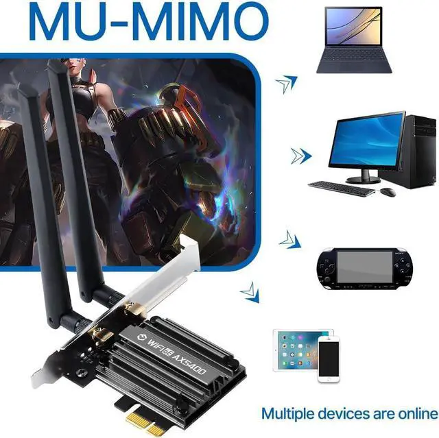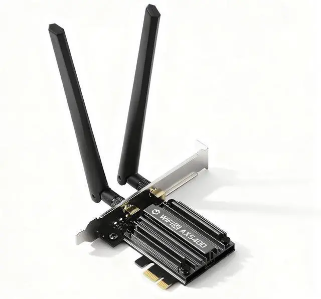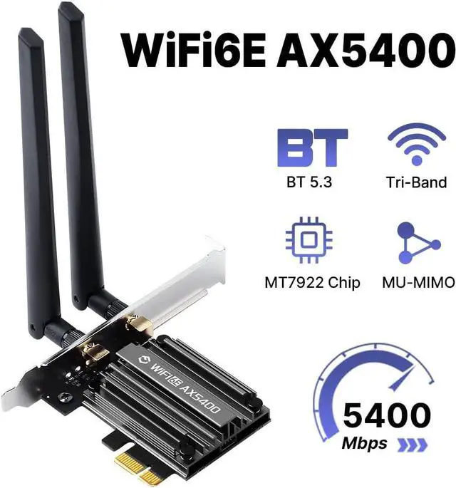 ?? Unlock the uncongested 6GHz band (160MHz channel) for interference-free performance while Bluetooth 5.3 ensures ultra-low latency for headphones controllers and peripherals with LE Audio support???????????????????? -???????????????????????????????? Equipped with MU-MIMO OFDMA and 160MHz channel width to efficiently handle multiple devices simultaneouslyperfect for smart homes and crowded networks?????????????? -?????????????????????????????? Features a PCIE X1 X4 X8 X16 slot compatibility detachable 6dBi high-gain antennas for extended range and a heat sink to maintain stability during heavy usage?????????????????????????? Powered by the upgraded MT7922 chip for reliable Wi-Fi 6E performance backward compatible with Wi-Fi 5/4 and optimized for Windows 10/11 systems
