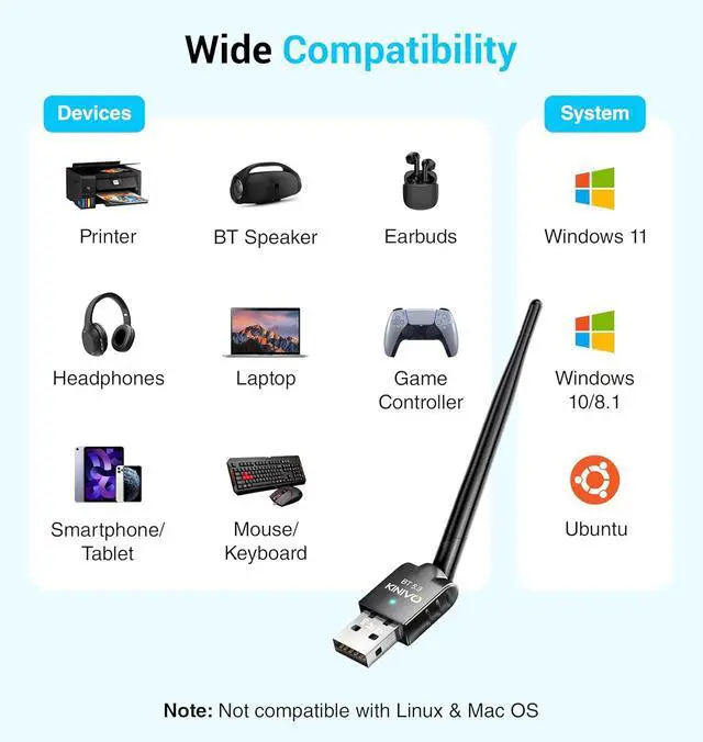 WIDE COMPATIBILITY: Kinivo Bluetooth adapter for PC is compatible with 32 bit and 64 bit Windows 11/10/ 8.1 /8 Ubuntu Windows 8 PCs that do not have built-in Bluetooth function?
