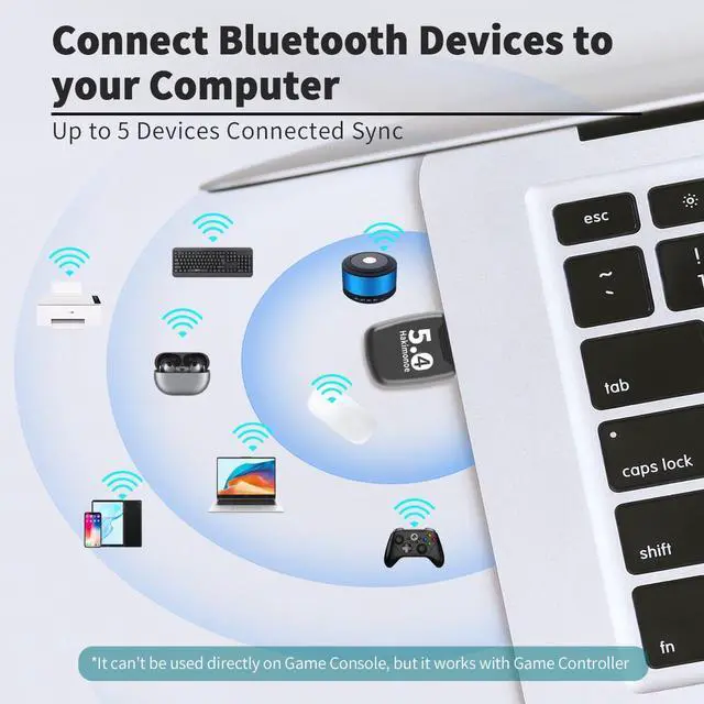 Devices Sync Connected: - BT542 Bluetooth 5.4 dongle for PC Laptop supports up to 5 devices to be connected and can work together at the same time without interfering with each other Which means that you can listen to high-quality music while using the keyboard or other devices. But If Bluetooth audio devices of the same type (such as speakers/headphones) are connected only one device can play musicIMPORTANT