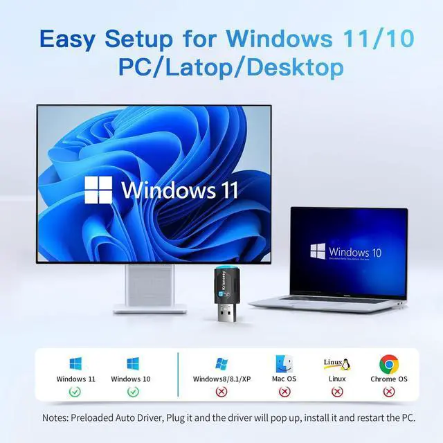 Built-in Auto Driver: This AX902B WIFI Bluetooth 5.4 Dongle is developed for Windows 11/10 PC/Laptop/Desktop only and does not support other systems. It comes with pre-installed drivers automatically recognizing and configuring itself for quick setup on your Windows 10/11 system. No need to download drivers saving time and worry. Please note this Adapter doesn't support MacOS/Linux/Win 8 8.1 7 XP. New Generation