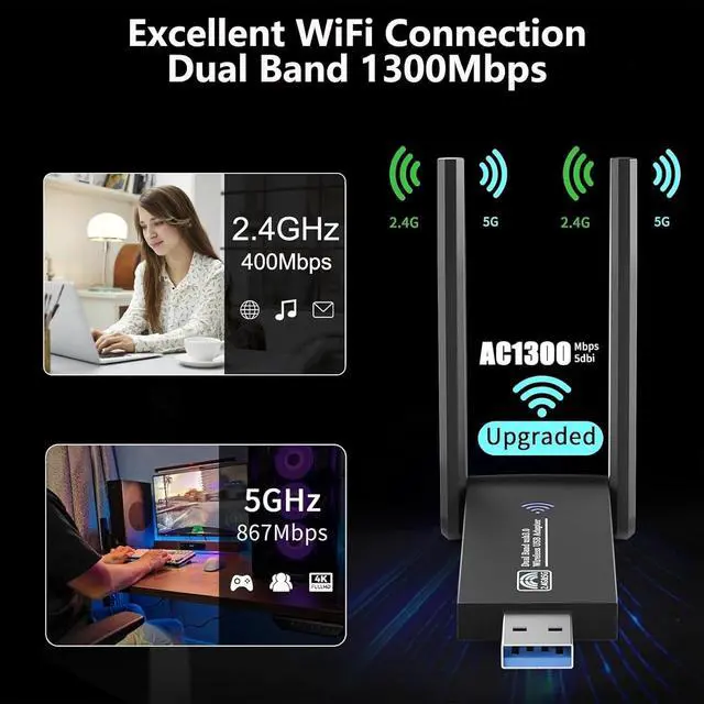 AC1300 USB WiFi Adapter: Get WiFi speeds up to 400Mbps on 2.4 GHz band and up to 867Mbps on 5GHz band. With this wireless usb adapter web surfing gaming and streaming online is much more enjoyable without buffering or interruptions. Ultra-fast wifi adapter with 802.11 ac technology.