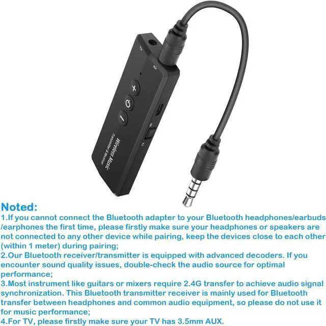 Our Bluetooth adapter is equipped with advanced decoders. If you encounter sound quality issues double-check the audio source for optimal performance; 3. Most instruments like guitars require 2.4G transfer to achieve audio signal synchronization. This Bluetooth adapter is mainly used for Bluetooth transfer between headphones and common audio equipment please do not use it for music performance; 4. For TV please firstly make sure it has 3.5 mm AUX.