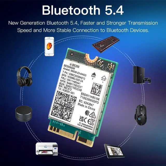 ???????? -??????????????????????????: Experience the future of wireless with Intel's BE200 card achieving staggering speeds up to 5.8 Gbps. Leverage the new 6 GHz band 320 MHz channel width and 4096-QAM technology for lightning-fast downloads seamless 4K/8K streaming and lag-free gaming?????? -???????????????????????????????? &??????: Operates across 2.4 GHz 5 GHz and the pristine 6 GHz bands. A key feature of WiFi 7 is Multi-Link Operation (MLO) which allows simultaneous use of multiple bands for more stable connections reduced lag and smoother roaming without dropping the signal??????????????????????????????????????????????????????????????????????: Built-in support for mandatory technologies like OFDMA and MU-MIMO (from WiFi 6) ensures optimal network efficiency in crowded environments. This makes it ideal for bandwidth-intensive applications such as VR/AR high-resolution video conferencing and competitive gaming????????????????????????????????????????????????????????????????????.??: Comes equipped with Bluetooth 5.4 providing enhanced audio quality for multiple streams improved range and lower power consumption for your peripherals and devices compared to previous versions????????????????????????????????????????????????????: This is an M. 2 NGFF (E Key) module designed for laptops. Please be aware that it is not compatible with AMD-based laptops. It supports 64-bit Windows 10 Windows 11 and Linux (Kernels 6.5 +) operating systems. For optimal performance a WiFi 7 ( 802.11 be) router is required