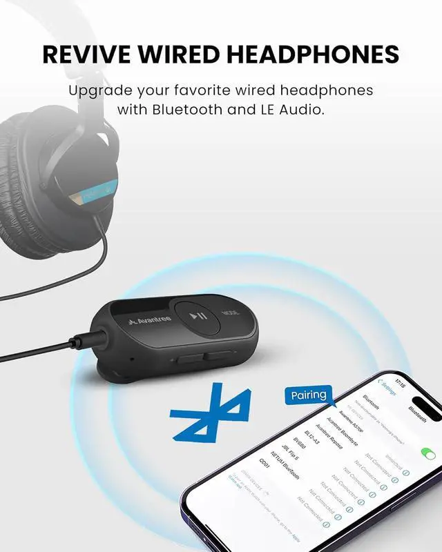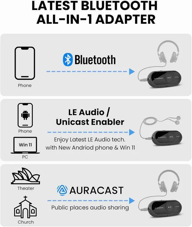 WORKS WITH LE AUDIO DEVICESConnect effortlessly with LE Audioenabled phones and PCs such as Galaxy S24 / Z Fold5 Pixel 8 or Windows 11 laptops with Bluetooth 5.4. Enjoy LC3 sound and Auracast broadcast support. JOIN AURACAST BROADCASTSAuto-scan or use the Avantree App to discover and join nearby Auracast broadcasts perfect for gyms classrooms public venues or shared TV listening. UPGRADE YOUR WIRED HEADPHONESPlug your favorite wired earbuds or headsets into the AS70P to make them fully wireless with Bluetooth 5.4 and low-latency audio for streaming calls or gaming. POWERED BY QUALCOMM CHIPDelivers high-quality low-lag sound with aptX Adaptive and LC3 codecs.