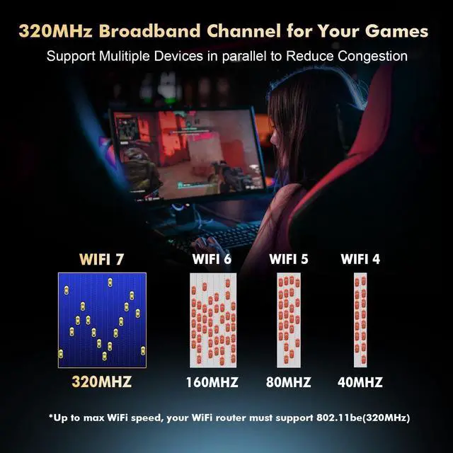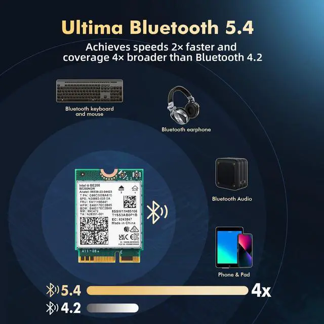 WiFi7 8774MbpsThis WiFi7 Card is equipped with the Intel BE200NGW chipset support WiFi7 IEEE 802.11 be/EHT Standard compatible with IEEE 802.11 a/b/g/n/ac/ax WiFi6E/WiFi6/WiFi5. With speeds up to 8774 Mbps (574Mbps @ 2.4GH z + 2400Mbps @5GHz + 5800Mbps @6GHz) support seamless streaming high-speed file transfers without any dropped connections. 6GHz BandSay goodbye to WiFi signal congestion with 6GHz band. 320MHz Wider channel and faster data throughput make it perfect for high-bandwidth applications such as NAS Gaming 8K HD video fully utilize the performance of the WIFI7 router. **Windows 11 or upgrade to Windows 10 Dev version 64-bit**Bluetooth 5.4S upport the latest Bluetooth 5.4 technology.