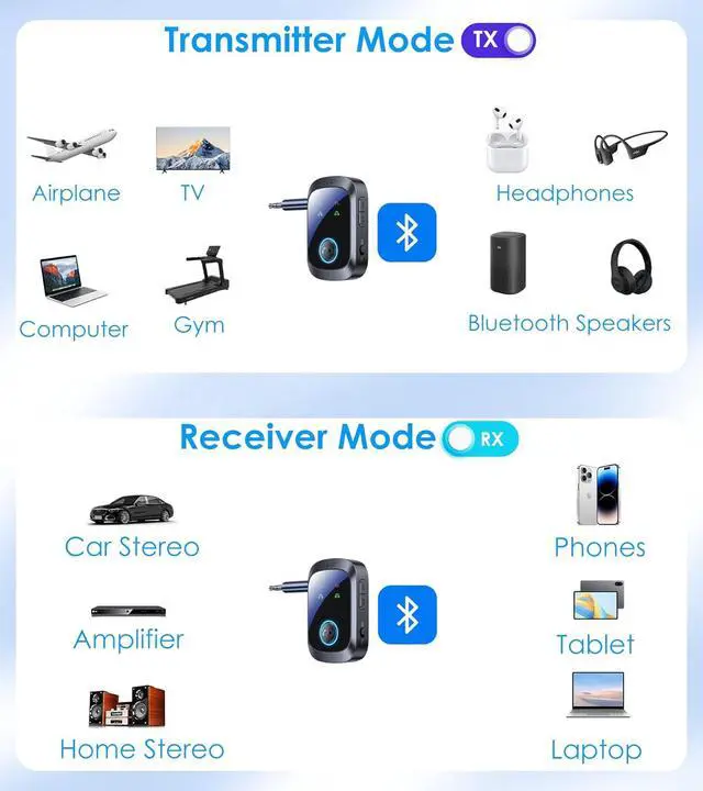 2-IN-1 TRANSMITTER & RECEIVER: On the right side of the Bluetooth aux adapter is a switch to toggle between transmit (TX) mode and receiver (RX) mode.? In TX mode the Bluetooth adapter for TV transmits audio from an analog source like an in-flight entertainment system or TV to your headphones.? RX mode receives audio from your phone to play through the aux-in port of a car boat or stereo system.