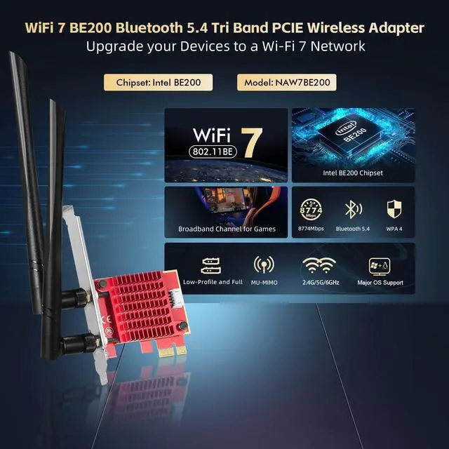 WiFi7 8774MbpsThis WiFi Card7 BE200 is equipped with the Intel BE200NGW chipset support WiFi7 IEEE 802.11 be/EHT Standard compatible with IEEE 802.11 a/b/g/n/ac/ax WiFi6E/WiFi6/WiFi5. With speeds up to 8774 Mbps (574Mbps @ 2.4GH z + 2400Mbps @5GHz + 5800Mbps @6GHz) support seamless streaming high-speed file transfers without any dropped connections. 6GHz BandSay goodbye to WiFi signal congestion with 6GHz band. 320MHz wider channel and faster data throughput make it perfect for high-bandwidth applications such as NAS Gaming 8K HD video fully utilize the performance of the WIFI6E router. **Windows 11 or upgrade to Windows 10 Dev version**Bluetooth 5.4S upport the latest Bluetooth 5.4 technology.