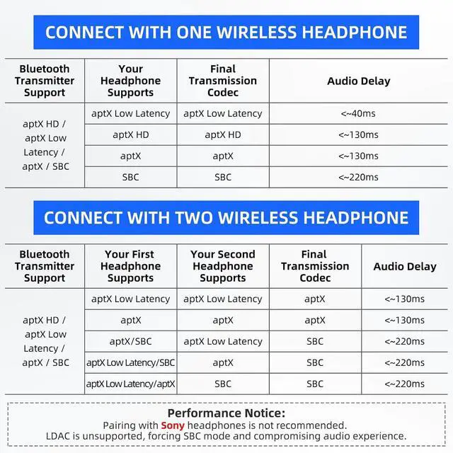 Support Audio Aptx low latency: This Bluetooth transmitter supports SBC/Aptx/Aptx HD/Aptx low latency/Aptx adaptive and will adapt according to your headset configuration.