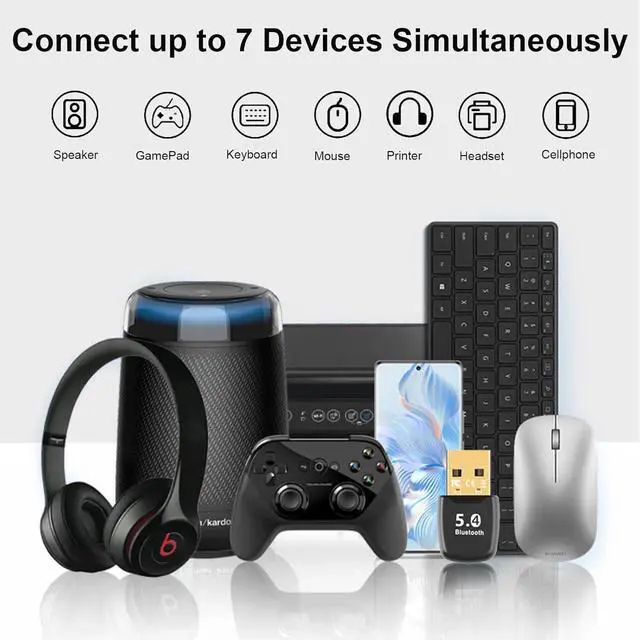 Mac OS)7 Devices Connecting Simultaneously: Our PC Bluetooth dongle supports pairing with 7 different types of Bluetooth devices at the same time without interfering with each other and save USB port. ( Bluetooth speaker Mouse Keyboard GamePad headphones printer cellphone)