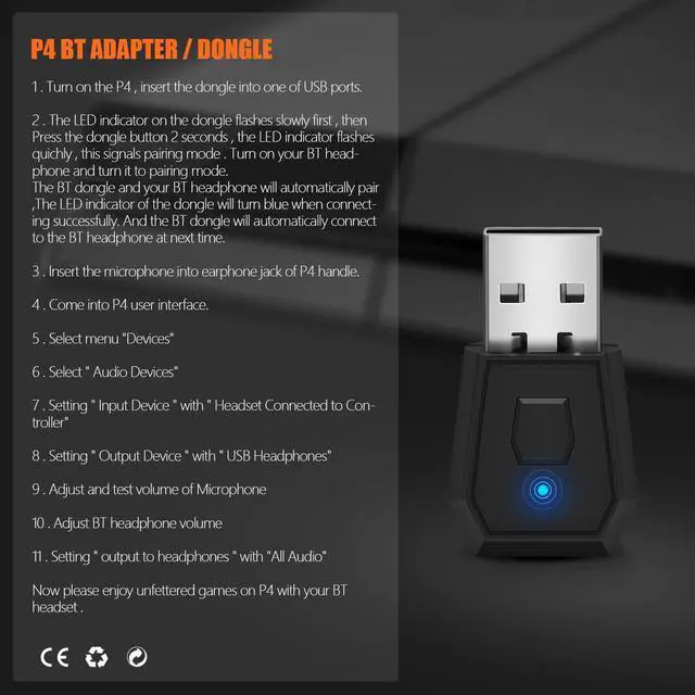 How to use: Turn on the game controller insert the dongle into the USB ports. Press the dongle button 2 seconds the LED indicator starts flashing slowly which means dongle entering the pairing mode. Turn on your Bluetooth headset and pair it. The LED indicator will turn blue when connecting successful. The Bluetooth headsets and the Bluetooth dongle will automatically pair in the next time you use.