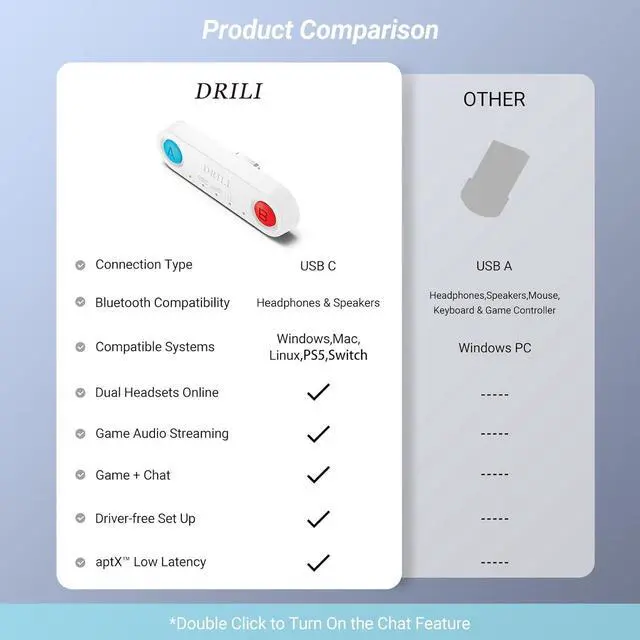 ???????????????????????????????????????????????? /??: Enjoy seamless communication during your gaming sessions by manually activating the MIC function. To enable it on PS5/4 just double-click the A/B button corresponding to the headset on the adapter. This easy method will ensure you're ready to chat with your fellow gamers.????????????????????: The wireless audio dongle is designed to eliminate the frustrating Bluetooth audio lag issue. With aptX Low Latency compatibility when paired with a Bluetooth headphone or speaker that also supports aptX-LL you'll experience minimal audio delay. The audio lag is significantly reduced to less than 40ms (220ms for standard Bluetooth)????????????????????????????????????????????: Enhance your audio capabilities effortlessly with the Bluetooth audio adapter. No need to install any drivers/software. Add Bluetooth audio capability (AUDIO devices ONLY no data) with ease to your PS5 PS4 Switch Desktop or iMac Linux or Chromebook.??????????????????????????????????: Indulge in late-night gaming sessions without disturbing your family or roommates. Stream audio from your PS5 PS4 or Switch into your Bluetooth headsets so you can enjoy your late-night gaming session without disturbing your family or roommates.???? &??????????????????????????: DRILI Bluetooth audio adapter is not limited to gaming. It's also a versatile tool for your work-from-home setup. It's also perfect for conference calls meetings Skype Zoom Teams Meet & more. The adapter seamlessly switches between Music and Talk modes when used on a Windows PC ensuring optimal audio quality whether you're immersed in work or play.