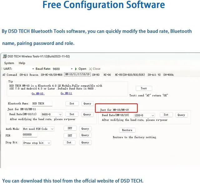 Free Software: DSD TECH provides free configuration software to help you quickly configure communication parameters such as baud rate or Bluetooth name.