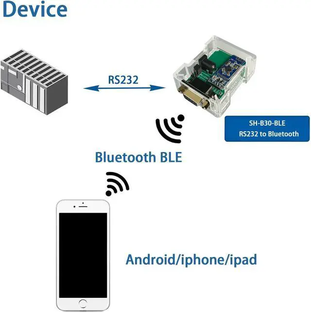 RS232: With this Bluetooth 5.0 BLE to RS232 adapter you can wirelessly connect your handheld device (iPhone/Android Phone) to devices that support RS232 communication.