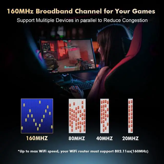 WiFi 6E 5400MbpsThis WiFi Card 6E is equipped with the Intel AX210 chipset providing ultrafast WiFi 6 and WiFi 6E support compatible with WiFi5/WiFi4. With speeds up to 5400 Mbps (574Mbps @ 2.4GH z + 2400Mbps @5GHz +2400Mbps @6GHz) support seamless streaming high-speed file transfers without any dropped connections. 6GHz BandSay goodbye to WiFi signal congestion with 6GHz band. 160MHz wider channel and faster data throughput make it perfect for high-bandwidth applications such as NAS Gaming 8K HD video fully utilize the performance of the WIFI6E router. **Windows 11 or upgrade to Windows 10 Dev version 64-bit**Bluetooth 5.3S upport the latest Bluetooth 5.3 technology.