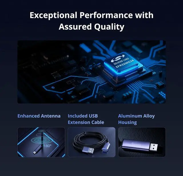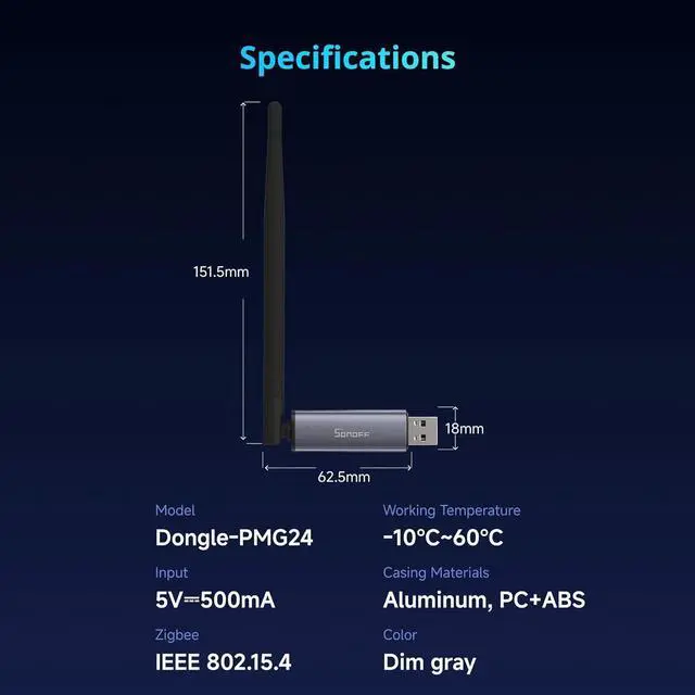 Powerful EFR32MG24 chip. Powered by the advanced EFR32MG24 chip offering richer resources and higher performance to deliver faster automation processing and stable sub-device control. Enhanced Antenna Gain. Default 3dBi antenna gain optimized up to 4.5 dBi for stronger signal strength and wider coverage ensures a reliable device connection. Wide platform compatibility. Zigbee Dongle works with Home Assistant Zigbee2MQTT openHAB and supports Zigbee 3.0 devices such as Hue Aqara IKEA Tradfri and SONOFF. Flexible firmware flashing. Firmware can be easily flashed via the SONOFF dongle flasher or Add-on to switch between Zigbee coordinator router or Thread RCP mode.