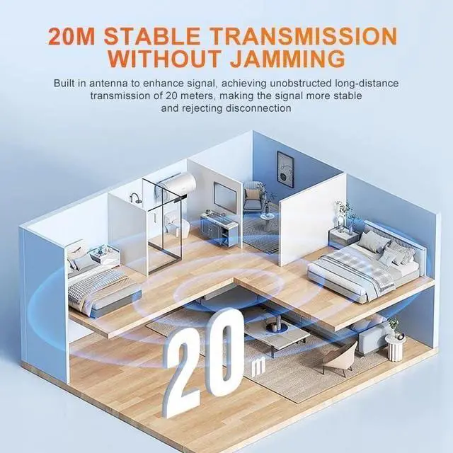 STABILE TRANSMISSION Without clamping: Built-in antenna to enhance the signal to achieve unimpeded long-distance transmission of 20 meters which makes the signal more stable and rejects separation.
