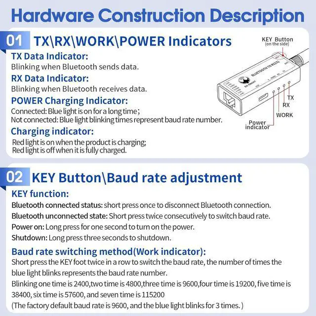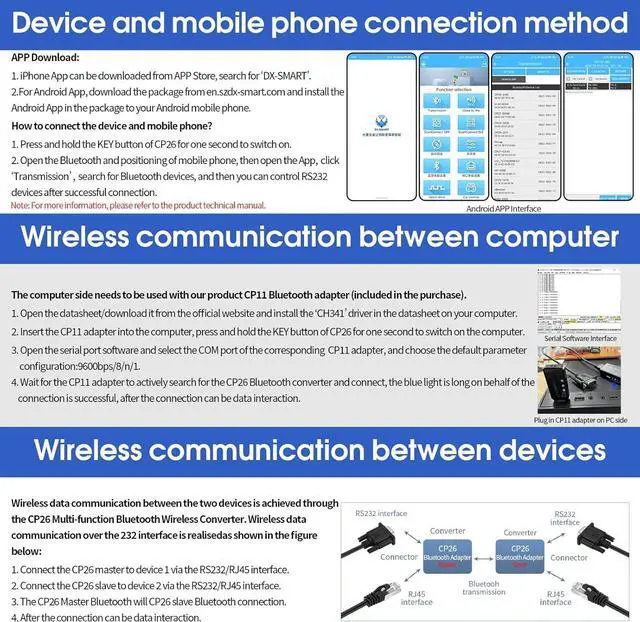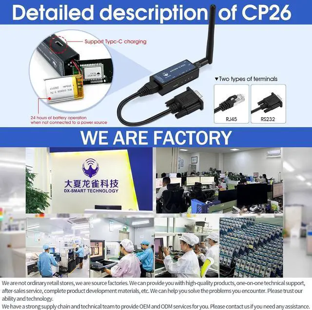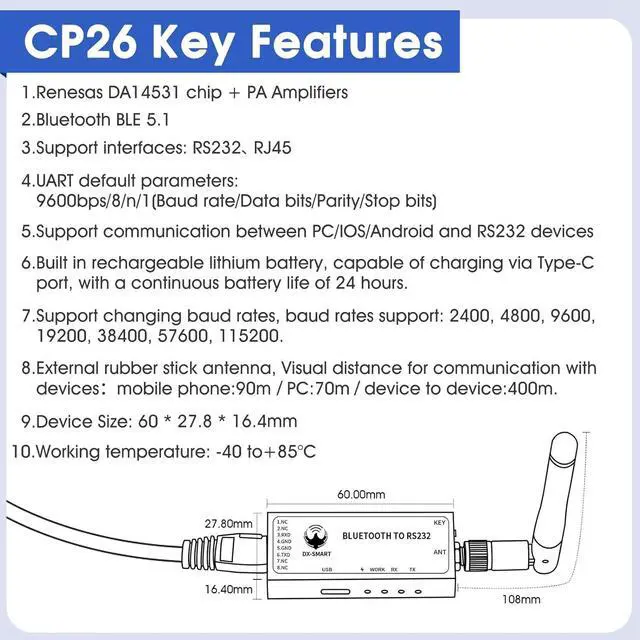 / device to device: 400m. Built-in rechargeable lithium batteryThe DX-CP26 has a built-in rechargeable lithium battery and does not require external power supply. It can be charged through the TYPE-C port and the battery life can reach up to 24 hours. Support baud rate switchingDX-CP26 supports button adjustment of baud rate supported baud rates: 2400 4800 9600 19200 38400 57600 115200 default 9600bps/8/n/1 (baud rate/data bit/no parity/stop bit). Short press the button twice to switch the baud rate once the number of blue light flashes represents the baud rate number one flash for 2400 two times/4800 three times/9600 four times/16200 five times/38400 six times/57600 seven times/115200Rich InformationWe provide a rich information package including: product manuals tutorial videos development and testing tools etc. You can access the user guide for complete product information by clicking on the product guide and document link below. Technical SupportWe are a manufacturer that supports OEM and ODM services. Please trust our capabilities and technology. If you encounter any problems please give us a chance before commenting. We will do our best to solve the problem for you. If you encounter any problems please contact us through User Guide Product Information Service Support.