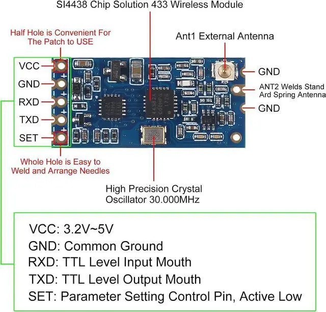 Supply Voltage: 3.2V ~ 5.5V. (If the module is to be in the transmitting state for a long time it is recommended to connect a 1N4007 diode in series when the power supply voltage exceeds 4.5V to avoid the built-in LDO heating of the module). Default Communication Distance (open field test): about 600m (the communication distance can be adjusted up to 1000m the air baud rate is 5000bps).