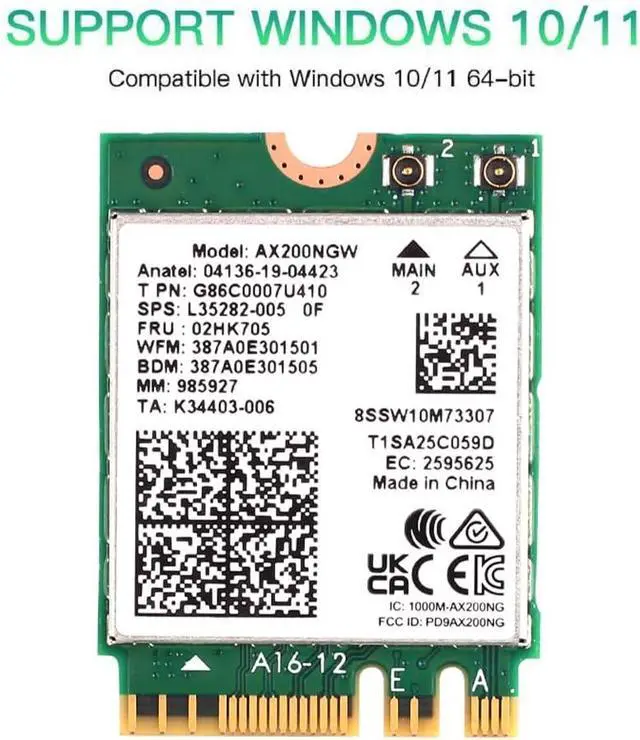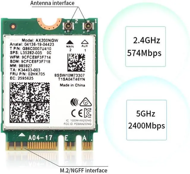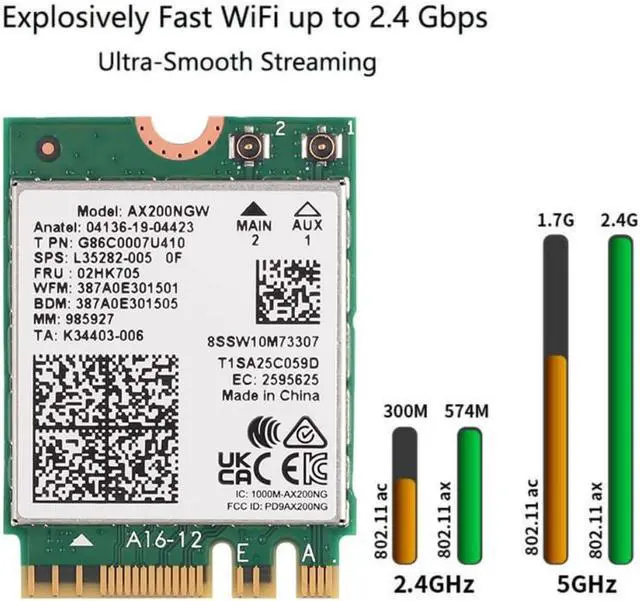 Note: AX200 wifi card Not compatible with AC 9560/9461/9462 models. Advanced Security & Performance with WPA3 & MU-MIMOThis wifi 6 card stay protected with WPA3 encryption while MU-MIMO technology ensures smooth stable connections in crowded networksperfect for gaming video calls and smart homes. Optimized for Gaming & High-Speed UseThis AX200 wifi 6 card designed for low-latency gaming and HD streaming this WiFi 6 card supports 160MHz channels & 2x2 antenna setup for maximum throughput. Ideal for replacing older WiFi adapters in desktops.