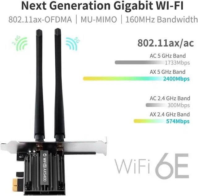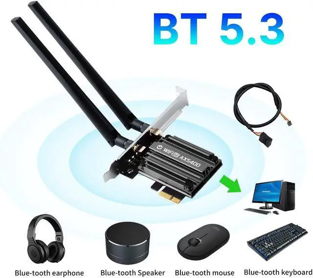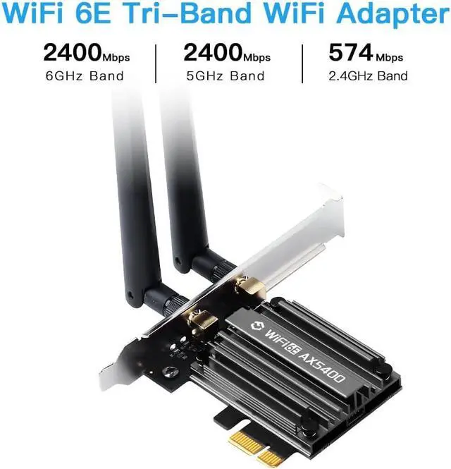 Tri-Band High-Speed ConnectivityExperience next-generation wireless speeds of up to 5400Mbps with simultaneous support for 2.4GH z 5GHz and 6GHz bands. Perfect for 4K/8K streaming online gaming and large-file transfers with near-zero latencyBT 5.3 Enhanced IntegrationBT 5.3 achieving 2x faster speeds and 4x broader coverage than BT 4.2. It adds LE enhanced connection/Host set Controller key length function/LE channel hierarchy function. Larger capacity extremely low latency and stronger battery life can quickly synchronize device channels to reduce interference greatly improve the transmission efficiency of audio streams between the host and the wireless headset for your Desktop PC ultimate setupBroad Windows CompatibilityWifi 6e designed specifically for desktop PCs running Windows 10 or Windows 11.