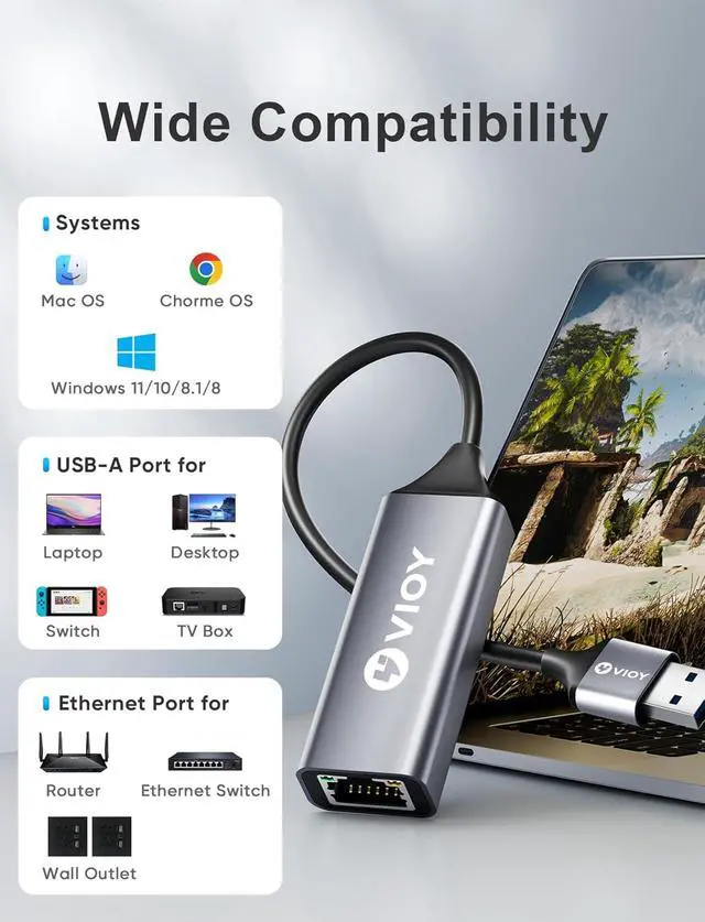 Speed: VIOY USB-A Gigabit Ethernet Adapter delivers full 1000 Mbps wired speeds to any device with a USB-A port. Perfect for gaming 4K streaming or home office setups this compact adapter ensures lag-free browsing no dropouts and seamless connectivityPlug and