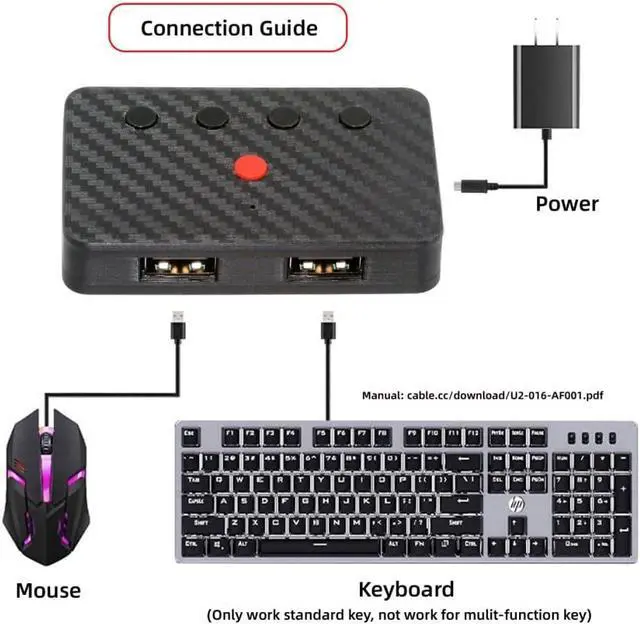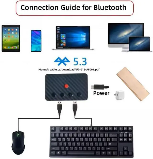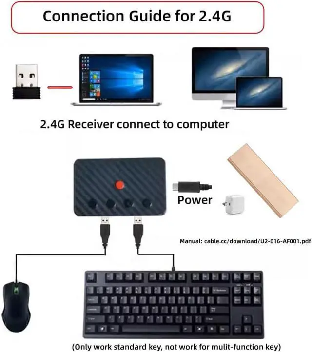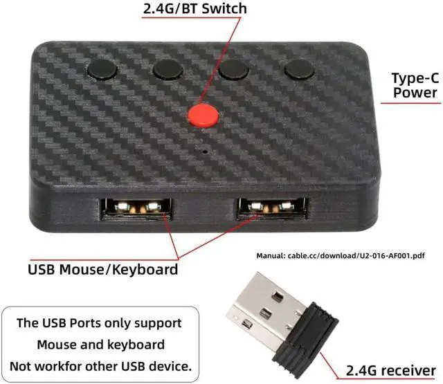 You can convert wired keyboard and mouse to BT or wireless 2.4G. BT mode supports switching 8 devices You only need to connect our adapter by BT. Wireless 2.4G mode also supports switching 8 devices. You need to purchase the extral 2.4G receiver separately. (only one receiver in the package. )This converter can convert wired USB keyboard and mouse into wireless and is suitable for use on laptops tablets and phones that need to use wireless keyboards and mice. The package included one wireless adapter and 2.4G receiver. you can download the manual by Manual----cable.