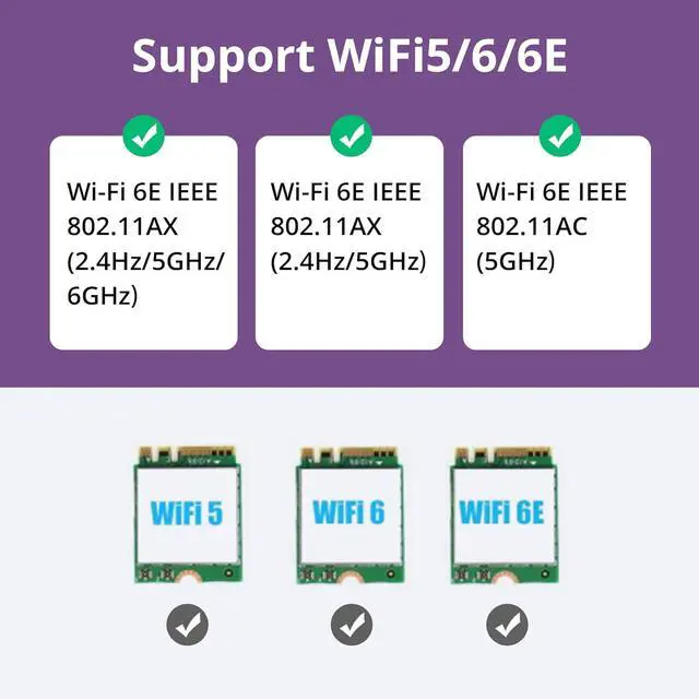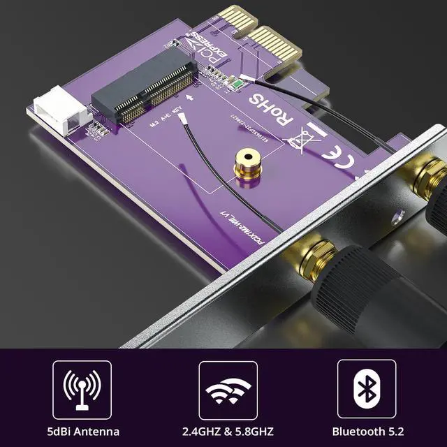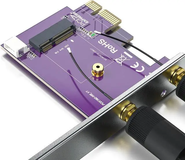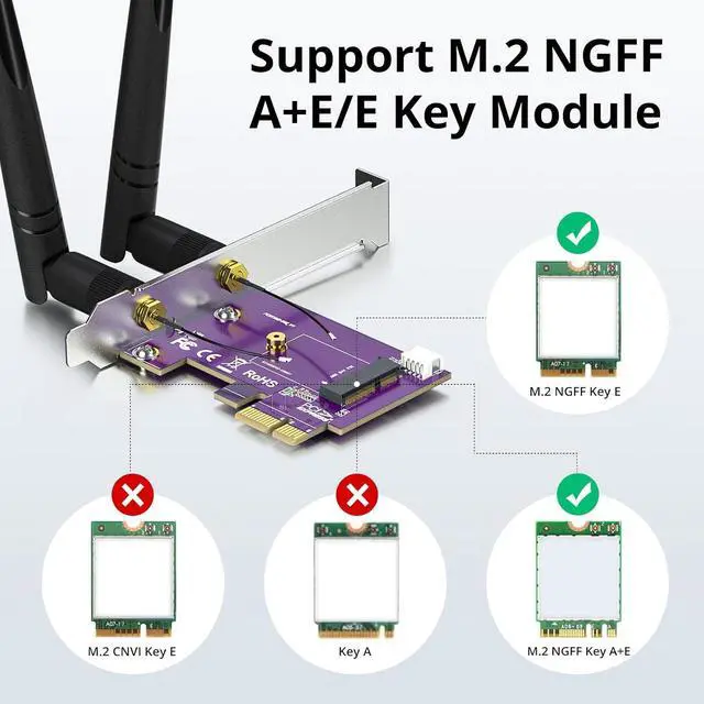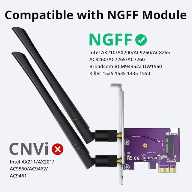 NOT support Intel AX211 AX201 9560ac 9461ac 9462ac wireless network card and wireless network card for laptop. PCIE X1 to M. 2/NGFF (A+E Key) WiFi Bluetooth Wireless Module Adapter Card can support PCIe WiFi and USB Bluetooth at the same time support AMD and Intel motherboard computers. NOT support hot swapping. Can support notebook M. 2 wireless network card + bluetooth transfer to desktop computer using transfer card this product is a full height baffle. Compatible with multiple operating systems. Comes with a bluetooth cable USB 9pin female to small 4pin black dupont cable 30cm.