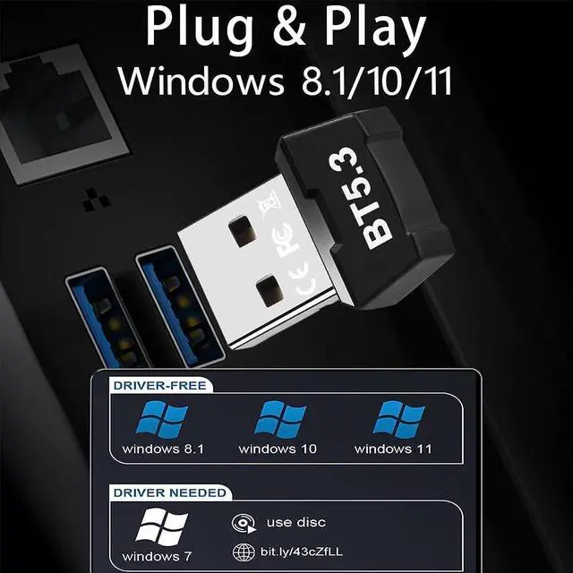 Latest Upgraded Bluetooth 5.3 dongleUsb bluetooth adapter uses the latest upgraded Bluetooth 5.3 BR+EDR technology greatly improves the stability of the connection data transfer speed. Backward compatible with Bluetooth 5.0 / 4.2 / 4.1 / 4.0 / 2.1 / 2.0 dual-mode Bluetooth transmission reduce transmission efficiency loss due to 2.4GH z band interference improve stability and anti-interferencePlug & Play 5.3 Bluetooth Dongle is plug and play no need to install driversbluetooth dongle for PC supports Windows 11/10/ 8.1. Not work with Mac OS Linuxcar stereo systems XBOX ps4 or