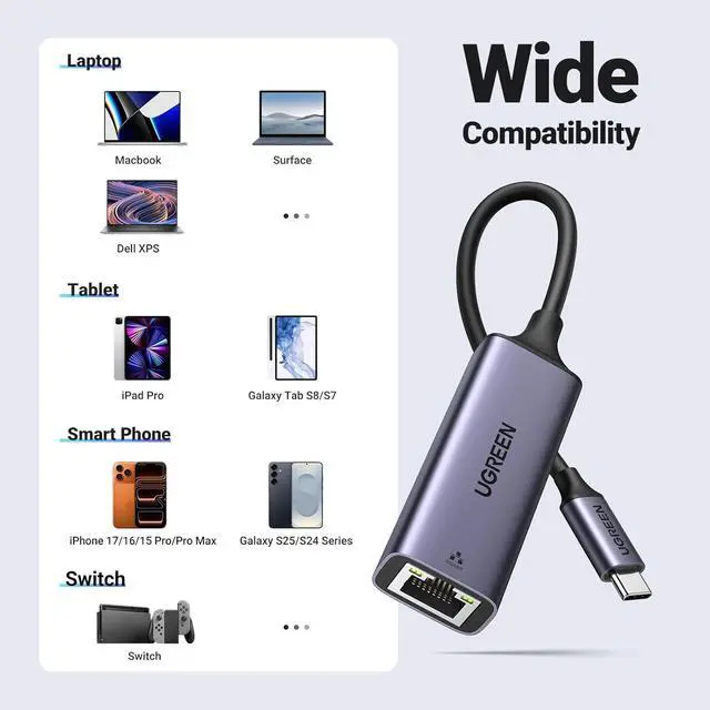 USB-C Meets 1000Mbps Ethernet in SecondsUGREEN usb c to ethernet adapter supports fast speeds up to 1000Mbps and is backward compatible with 100/10Mbps network. Perfect for work gaming streaming or downloading with a stable reliable wired connectionExtend a Ethernet Port for Your DeviceThis ethernet to usb c adds a Gigabit RJ45 port to your device. Its the perfect solution for new laptops without built-in Ethernet devices with damaged LAN ports or when WiFi is unavailable or unstablePlug and