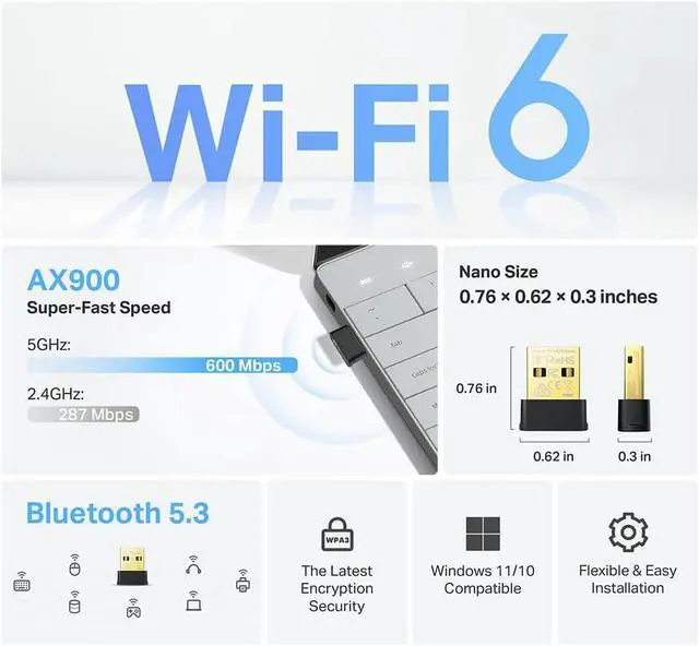 ?????????????????????????????????????????????? - Archer TX10UB Nano features the combination of the functionality between Bluetooth adapter and WiFi adapter.???????? -?????????????????? -?????????????????????? -?????? Achieve total bandwidth of 900 Mbps with up to 287 Mbps on 2.4 GHz and up to 600 Mbps on 5 GHz upgrading your PC to higher Wi-Fi performance.