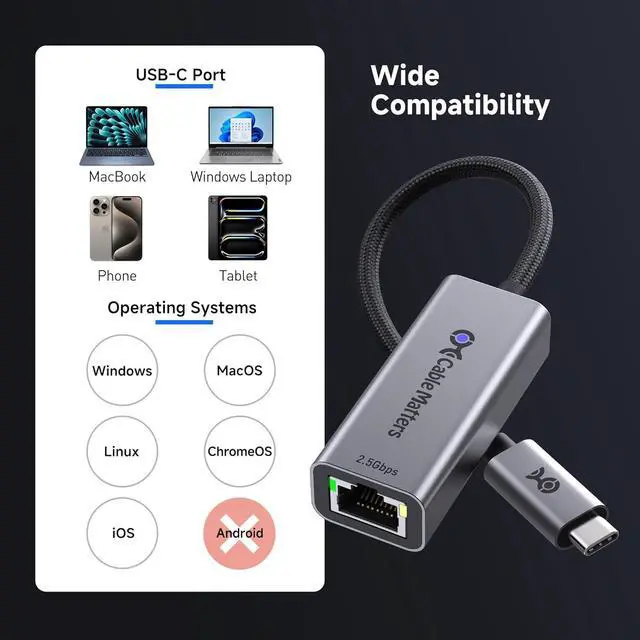 Advanced Chipset: This USB C Ethernet adapter 2.5 Gigabit ensures consistent performance while minimizing power consumption and heat. Enjoy uninterrupted high-speed connections offering faster and more secure network access than wireless and most wired solutions.
