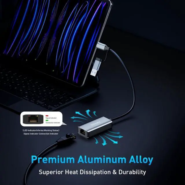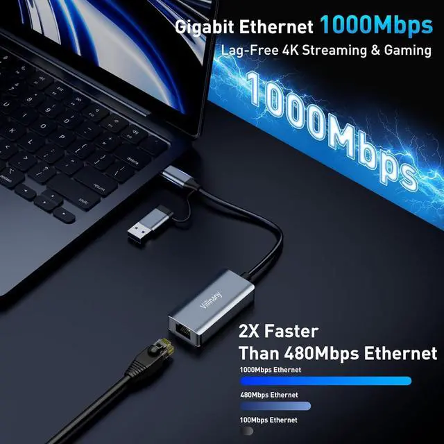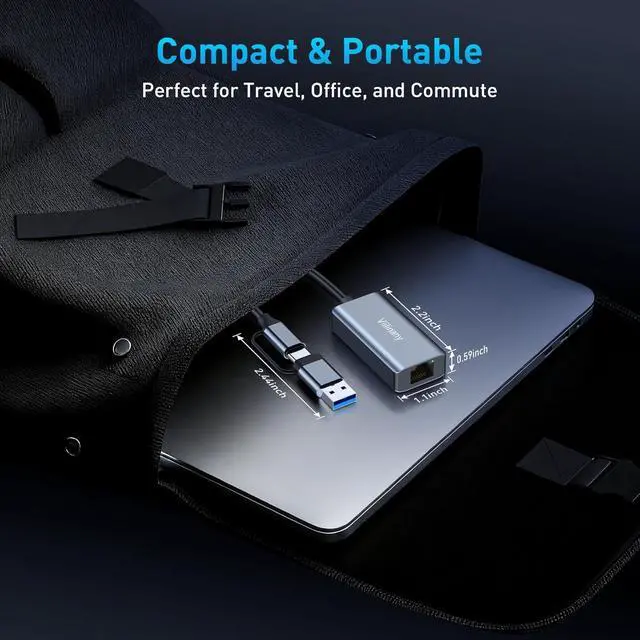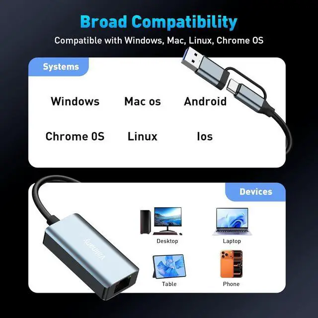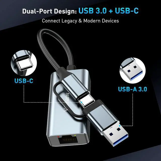 Dual-Port USB-C & USB-A Design: Featuring a versatile 2-in-1 design this USB C to Ethernet Adapter doubles as a standard Ethernet connector seamlessly bridging the gap between generations. It effortlessly connects a wide range of devicesfrom legacy PCs to modern Ultrabooks MacBooks tablets and smartphoneswithout needing extra converters. With its dual interfaces this USBC to Ethernet adapter offers significantly broader device compatibility and a wider usage range compared to standard single-port alternatives. Broad Compatibility & Plug and