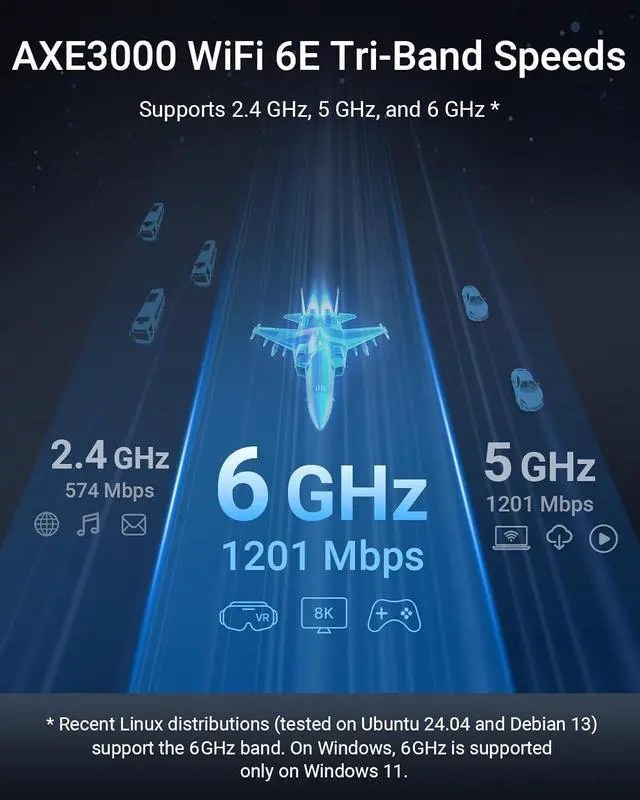 Broad Linux Compatibility: The Linux USB WiFi adapter is compatible with Ubuntu Debian Fedora Arch openSUSE and more. Perfect for users running dual-boot setups multiple distros or virtual machines. Also supports Windows 11/10 (driver required) WiFi 6E