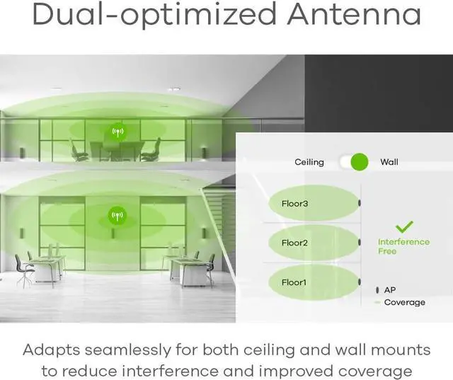 Traditional APs are ceiling-optimized, but wall mounting often compromises coverage and causes floor-to-floor interference. Zyxel's switchable dual-optimized antenna adjusts seamlessly for ceiling or wall mounts, directing energy forward in wall setups to enhance coverage and minimize interference.