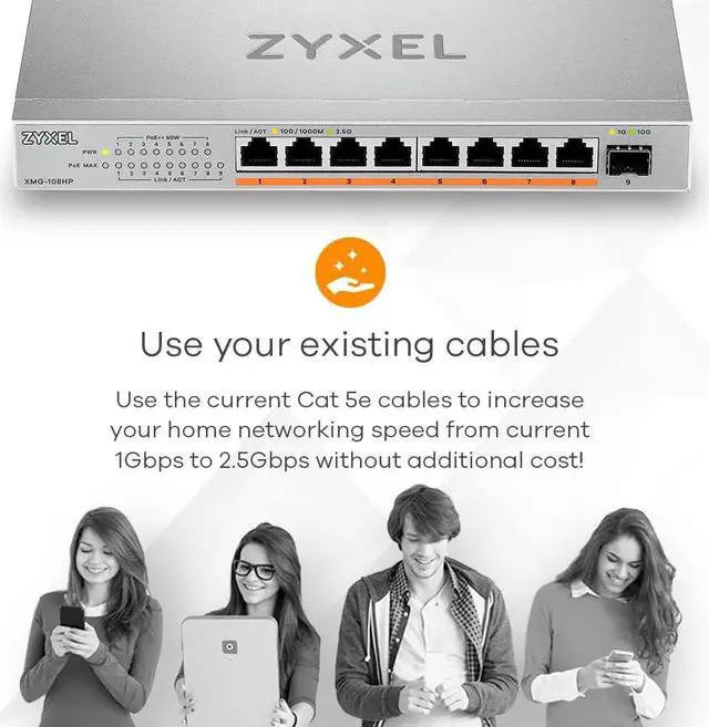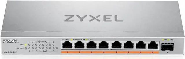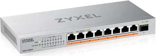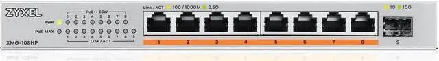 The Zyxel XMG-100 Series 2.5 Gigabit switch is theideal choice for home, SOHO, or small office users who want to upscale theirnetwork with increasing demands coming from online gaming activities,multimedia streaming services or faster wireless network connectivity. Allports are equipped with 2.5 Gigabit Ethernet speed, allowing easy networkspeed upgrade. In addition, this Series offers an extra SFP+ slot for 10Gnetwork uplink or access to a NAS.