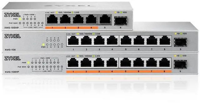 The Zyxel XMG-100 Series 2.5 Gigabit switch is the idealchoice for home, SOHO, or small office users who want to upscale theirnetwork with increasing demands coming from online gaming activities,multimedia streaming services or faster wireless network connectivity. Allports are equipped with 2.5 Gigabit Ethernet speed, allowing easy networkspeed upgrade. In addition, this Series offers an extra SFP+ slot for 10G networkuplink or access to a NAS.