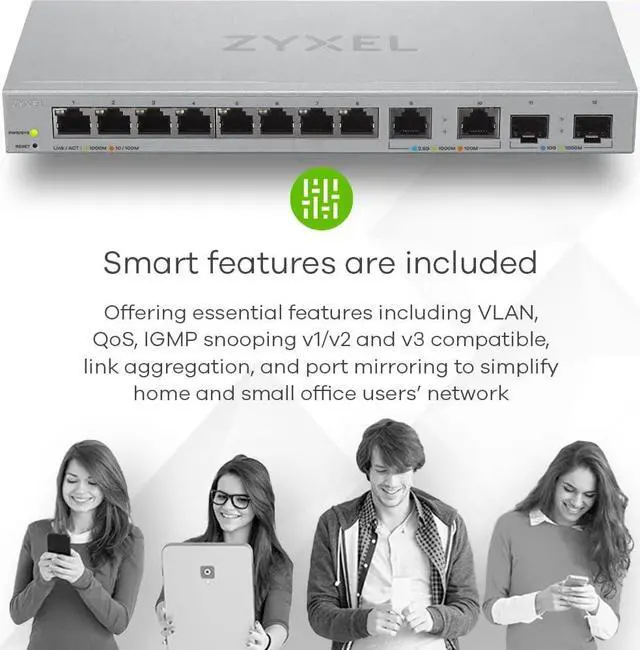 XGS1210-12 Maximums the flexibility for your network. Experience hyper-fast 2.5G networking! 10G SFP+ ultra-speed uplink Easy management with intuitive GUI Comprehensive smart features Saving energy and space.