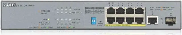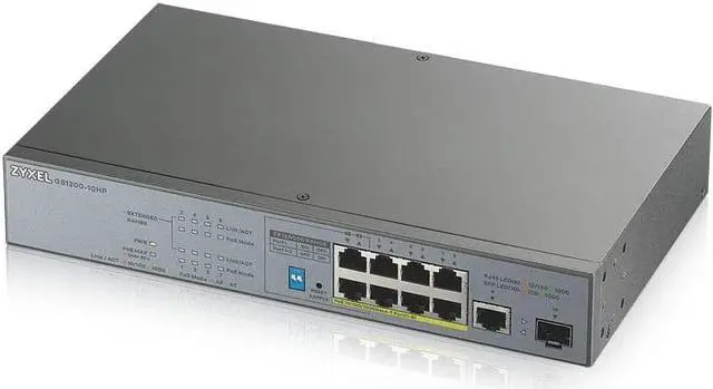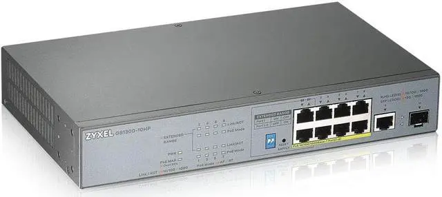This ItemZyxel 8-port Gigabit Unmanaged PoE+ Switch with 130 Watt Budget and 1 Gigabit Copper Port + 1 SFP, Long Range PoE Switch [GS1300-10HP]RecommendationsZyxel 16-port Gigabit Unmanaged PoE+ Switch with 170 Watt Budget and 1 Gigabit Copper Port + 1 SFP, Long Range PoE Switch [GS1300-18HP] POE Gigabit Switch 12 Ports 1000Mbps Switches with 2 uplink & 2 SFP: TEROW 8-Port PoE Ethernet&10-Port Network with 2 SFP Module,120W,802.3af/at Compliant, Plug & Play, Metal Fanless with Shielded Zyxel 12-Port Web-Managed Multi-Gigabit Switch | 3X 10 | 1x 10G SFP+ [XGS1250-12] TRENDnet 8-Port 2.5Gb Multi-Gigabit Unmanaged Gaming Switch, TEG-S380, 8 x 2.5GBASE-T Ports, 25Gbps Switching Capacity, Ethernet Splitter, NDAA & TAA Compliant, Fanless, Lifetime Protection, Black Zyxel 8-Port 2.5Gb MultiGig Switch | 5X 100/1G/2.5G Ports + 1x 10G SFP+ | 8X PoE++ Port | 100W Budget | Plug & Play | Desktop or Wall-Mount [XMG-108HP]