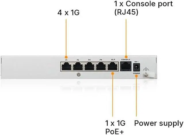 FLEXIBLE SOFTWARE-DEFINED PORTS: 5 x 1G RJ-45 ports (port 5 supports PoE+) assignable as WAN or LAN, WAN load balancing, active-backup failover, 8 VLAN interfaces, and Link Aggregation for resilience