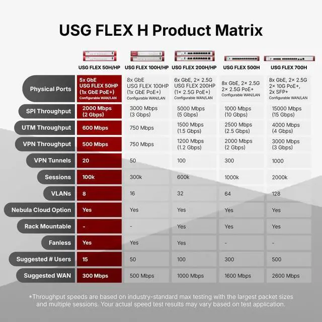 NEBULA MANAGEMENT AND VPN: Centralized policy control, monitoring, and SD-VPN orchestration; supporting IKEv2/IPSec, SSL, Tailscale VPN, 20 concurrent IPSec tunnels, 15 SSL VPN users, and up to 12 managed APs